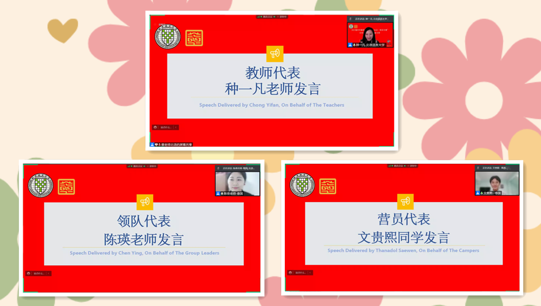 10月24日,为期10天的2021海外华裔青少年“魅力北京·情系冬奥”中华文化体验线上秋令营举行了隆重而热烈的在线闭营典礼。本期秋令营由北京市人民政府侨务办公室主办,北京语言大学中华文化国际传播中心和汉语速成学院共同承办。闭营典礼上,北京市人民政府侨务办公室副处长胥国和,北京语言大学汉语速成学院院长苏英霞、中华文化国际传播中心学术委员会副主任朱子仪、泰国代表处主任于美英以及中华文化国际传播中心的项目负责老师,还有来自泰国、缅甸、蒙古国的133名华裔青少年及领队齐聚云端,共同见证了秋令营的完美收官。闭营典礼由中华文化国际传播中心的项目主管纵璨主持。