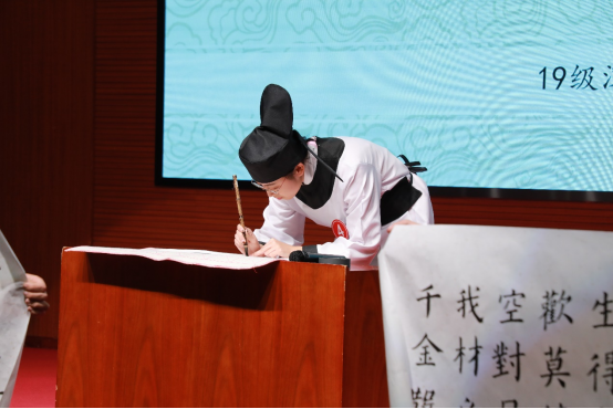 本次比赛还设置了才艺展示与知识问答环节。舞台上,有歌声悠悠、琴弦铮铮,是选手们以乐会友;有挥毫泼墨、红扇飞舞,是选手们以形传意。北语学子各显神通,以自信的介绍表达与精美的舞台设计,淋漓尽致地展现了个人所长和独一无二的青春风采。中华文化知识竞赛环节的题目内容包罗古今,涵盖历史典故、地理知识、文学常识、美术、音乐、戏曲知识等等。选手们沉心聆听,仔细作答,展现了深厚的知识储备与独到的文化见解,赢得阵阵掌声。答题间隙,冯惟钢老师从更加广博的视角讲解了题目背后的文脉赓续,探索字字句句中的文化积淀。