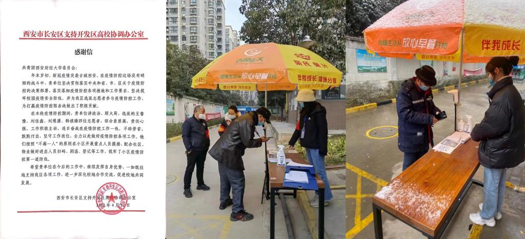 此次长安区疫情防控期间,我校积极响应,高度配合,精心组织选派多名志愿者参与疫情防控。志愿者们以实际行动践行大学生的使命与担当,诠释了“奉献、友爱、互助、进步”的志愿精神,充分展现出西财大学子优秀良好的精神风貌与责任担当。志愿服务期间,他们连日奋战坚守在防控工作的一线,全力以赴做好疫情防控各项工作。他们按照“不漏一人”的原则在小区开展重点人员摸排,配合社区、物业做好进出人员扫码、测温、登记等工作,用青春力量筑起了小区疫情防控第一道防线。