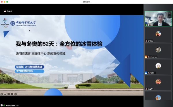 来自中国科学院大气物理研究所的谭哲韬同学以《我与冬奥的52天:全方位的冰雪体验》为题讲述了自己的“冰雪奇缘”,谭同学在介绍冬奥会新媒体数字平台的运营工作时提到,面对繁重的疫情统计,他创新工作方法与流程,迎难而上,高效地完成了任务,展现了在平凡的生活中对卓越与创新的追求。