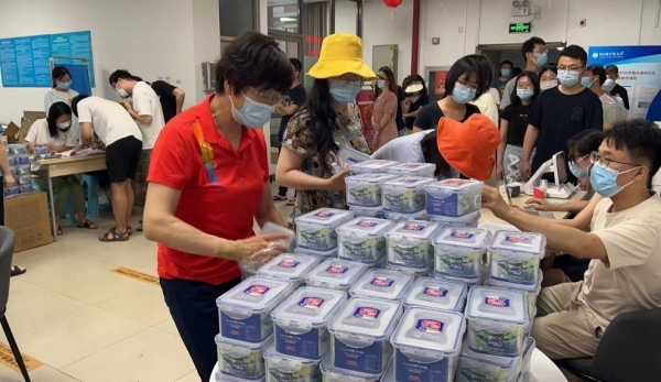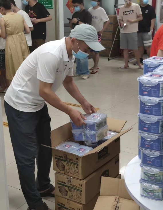 为了保证各类物资的及时发放,物业项目部办公室人员全部出动,校区老师及志愿者大力支持,大家分工明确,秩序井然,截至5约27日累为在校学生发放饭盒2095个、洗洁精226桶、口罩19630只。