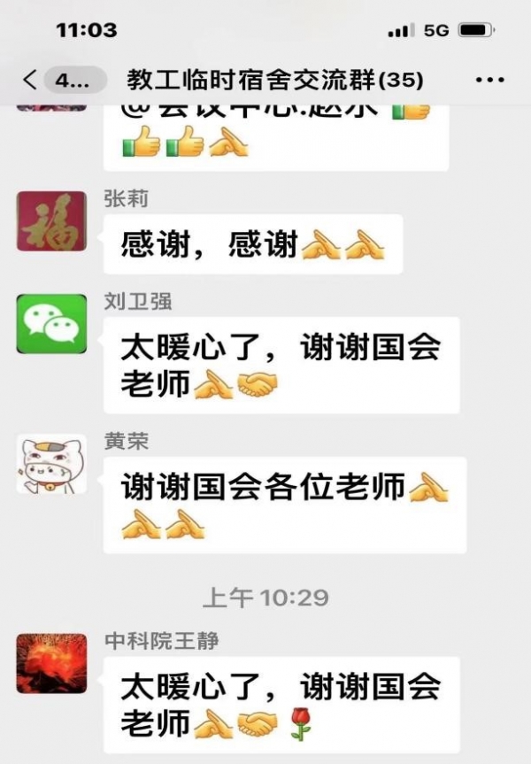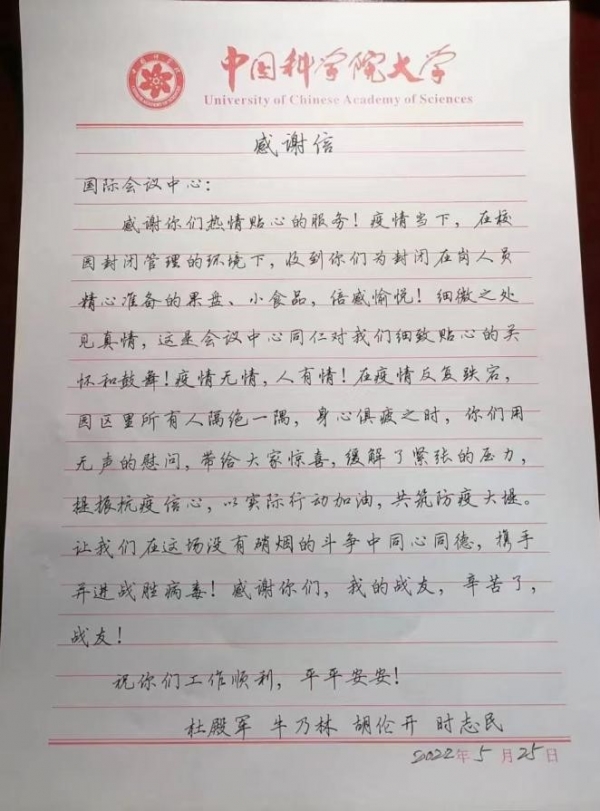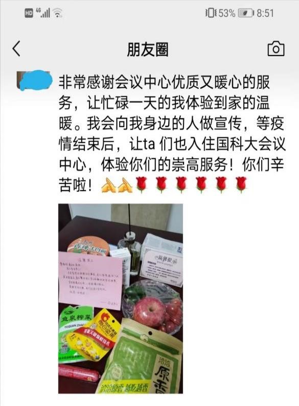面对这些感谢和肯定,会议中心校内保障服务小组组长蒋中菊说到“作为学校的接待服务部门,保障好这些坚守在学校的一线工作人员,是我们的职责所在,更重要的是能为学校的防疫工作贡献力量,是我们的一份荣耀!”