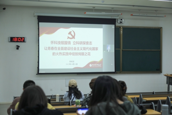 李树深在《怀科技报国情 立科研探索志 让青春在全面建设社会主义现代化国家的火热实践中绽放绚丽之花》报告中勉励同学们:选择国科大,就意味着选择了科技报国、创新报国,相信在中科院“科技创新、报国为民”的家国情怀熏陶下,在国科大“博学笃志、格物明德”的校训激励下,在科学家精神的引领下,大家一定能够把自己对科学的追求融入到加快建设科技强国,实现高水平科技自立自强的伟大事业中去,一定能让青春在全面建设社会主义现代化国家的火热实践中绽放绚丽之花!